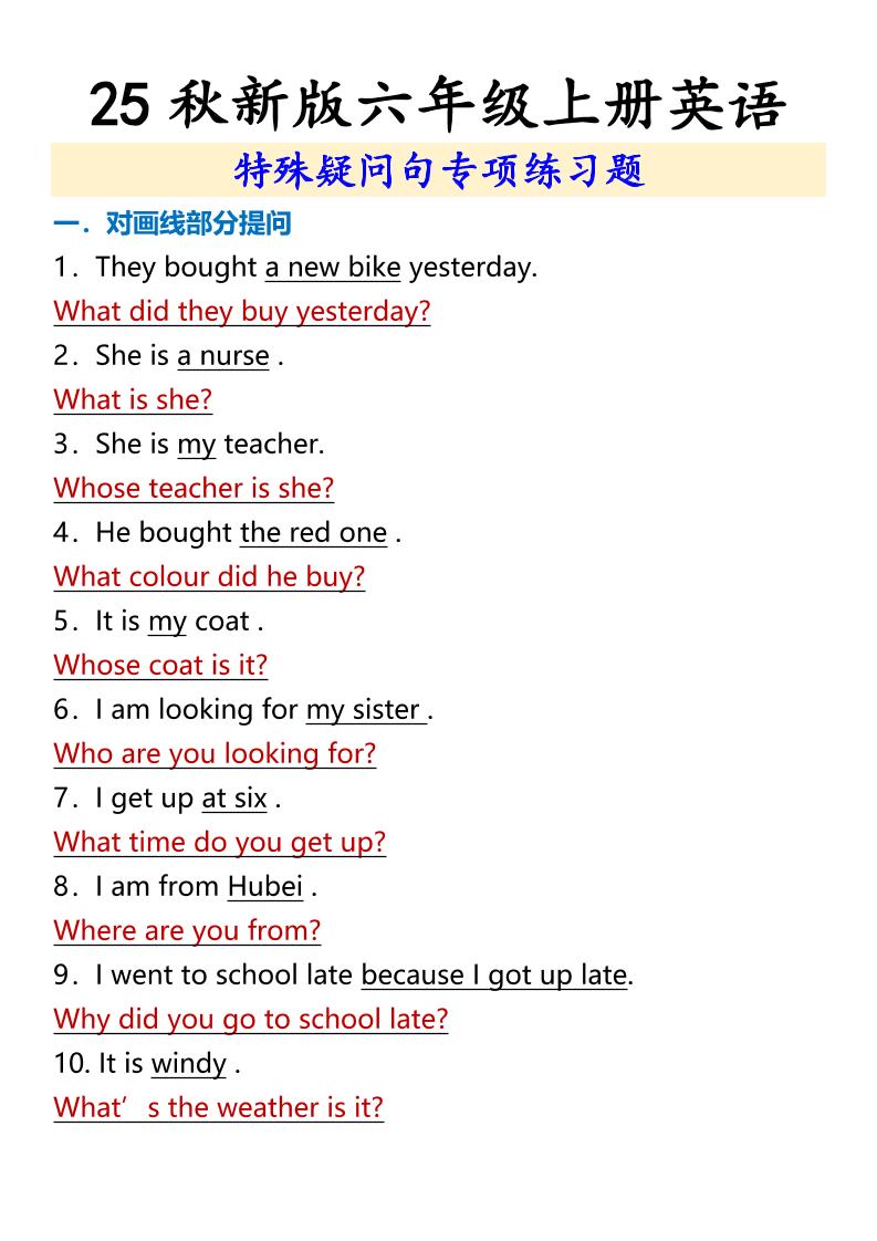 【2025秋新版】六年级上册英语特殊疑问句专项练习题