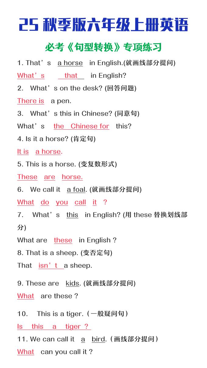 【2025秋新版】六年级上册英语必考句型转换
