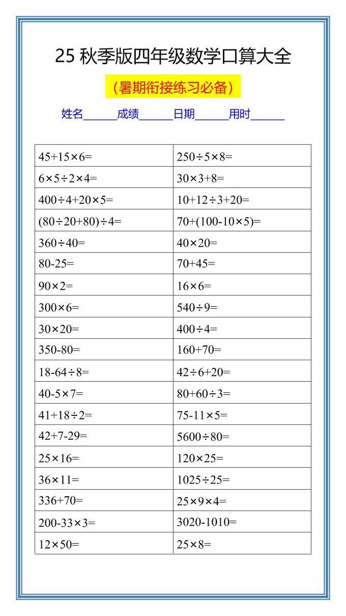 【2025秋新版】四升五数学暑假口算练习题-五上数学